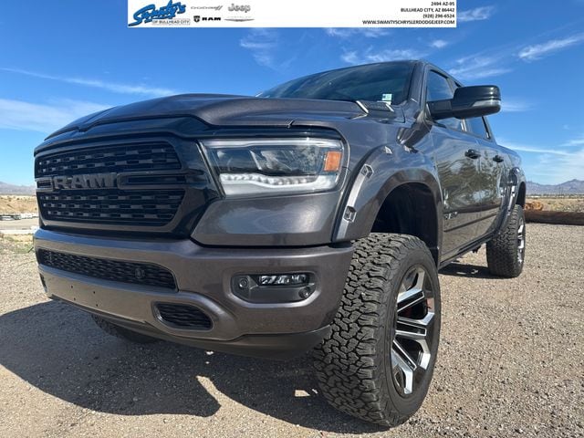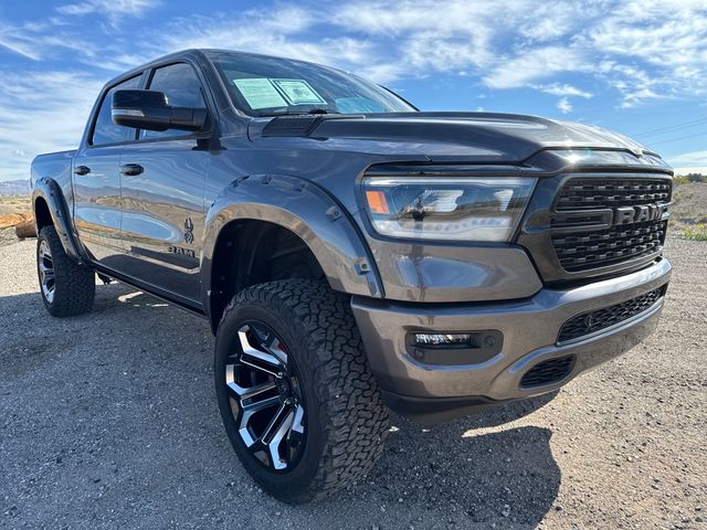 This Ram 1500 is equipped with the following features: Bed Utility Group (MOPAR 4 Adjustable Cargo Tie-Down Hooks, MOPAR Deployable Bed Step, MOPAR Spray In Bedliner, and Pick-Up Box Lighting), Big Horn Level B Equipment Group (115V Auxiliary Power Outlet, 12" Touchscreen Display, 2nd Row In Floor Storage Bins, 400W Inverter, 4G LTE Wi-Fi Hot Spot, 9 Amplified Speakers w/Subwoofer, Air Conditioning ATC w/Dual Zone Control, All R1 High Radios, All Radio Equipped Vehicles, Apple CarPlay, Auto-Dimming Exterior Driver Mirror, Auto-Dimming Rear-View Mirror, Black Exterior Mirrors, Black Premium Power Mirrors, Class IV Receiver Hitch, Cluster 7.0" TFT Color Display, Connected Travel & Traffic Services, Connectivity - US/Canada, Convex Wide-Angle Exterior Mirror Insert, Disassociated Touchscreen Display, Exterior Mirrors Courtesy Lamps, Exterior Mirrors w/Heating Element, Exterior Mirrors w/Supplemental Signals, For Details, Visit DriveUconnect.com, For More Info, Call 800-643-2112, Front Fog Lamps, Global Telematics Box Module (TBM), Glove Box Lamp, Google Android Auto, GPS Antenna Input, GPS Navigation, HD Radio, Heated Front Seats, Heated Steering Wheel, Integrated Center Stack Radio, Integrated Voice Command w/Bluetooth, LED Footwell Lighting, Media Hub w/2 Charge Only USBs, ParkSense Front/Rear Park Assist w/Stop, Power 2-Way Driver Lumbar Adjust, Power 8-Way Driver Seat, Power Adjustable Pedals, Power-Folding Mirrors, Radio: Uconnect 5 Nav w/12.0" Display, Rear Dome w/On/Off Switch Lamp, Rear Power Sliding Window, Rear Window Defroster, Remote Start System, Security Alarm, SiriusXM Radio Service, SiriusXM Satellite Radio, SiriusXM w/360L, Sun Visors w/Illuminated Vanity Mirrors, Universal Garage Door Opener, and USB Host Flip), Night Edition (3 Rear Seat Head Restraints, 4 Way Front Headrests, Accent Color Door Handles, Accent Color Premium Power Mirrors, Anti-Spin Differential Rear Axle, Black Exterior Truck Badging, Black Headlamp Bezels, Black Interior Accents, Black Painted Exterior Mirrors Caps, Body Color Front Bumper, Body Color Rear Bumper w/Step Pads, Bucket Seats, Center Console Parts Module, Deluxe Cloth Bucket Seats, Dual Exhaust w/Black Tips, Front Seat Back Map Pockets, Full Length Floor Console, Manual Adjust 4-Way Front Passenger Seat, RAM Grille Badge - Black, Rear 60/40 Folding Seat, Rear Center Armrest, and Wheels: 20" x 9.0" Premium Paint/Polished), Premium Lighting Group (Front LED Fog Lamps, LED Reflector Headlamps, and LED Taillamps), Quick Order Package 27Z Big Horn (Big Horn Badge), 33 Gallon Fuel Tank, 4-Wheel Disc Brakes, 48V Belt Starter Generator, 6 Speakers, ABS brakes, Air Conditioning, Alloy wheels, AM/FM radio, Brake assist, Bumpers: chrome, Cloth Bench Seat, Compass, Delay-off headlights, Dome Dual LED Reading Lamp, Driver door bin, Dual front impact airbags, Dual front side impact airbags, Dual-Pane Panoramic Sunroof, Electronic Stability Control, Emergency communication system: SiriusXM Guardian, Front anti-roll bar, Front Center Armrest w/Storage, Front License Plate Bracket, Front reading lights, Front wheel independent suspension, Fully automatic headlights, Heated door mirrors, Illuminated entry, Leather steering wheel, Low tire pressure warning, Manufacturer's Statement of Origin, MOPAR Front & Rear Rubber Floor Mats, Occupant sensing airbag, Outside temperature display, Overhead airbag, Overhead console, Overhead LED Lamps, Panic alarm, ParkView Rear Back-Up Camera, Passenger door bin, Passenger vanity mirror, Power door mirrors, Power steering, Power windows, Premium Overhead Console, Radio data system, Radio: Uconnect 3 w/5" Display, RAM Grille Badge - Chrome, Rear anti-roll bar, Rear seat center armrest, Rear step bumper, Rear Underseat Compartment Storage, Rear Wheelhouse Liners, Remote keyless entry, Speed control, Split folding rear seat, Steering wheel mounted audio controls, Tachometer, Telescoping steering wheel, Tilt stee